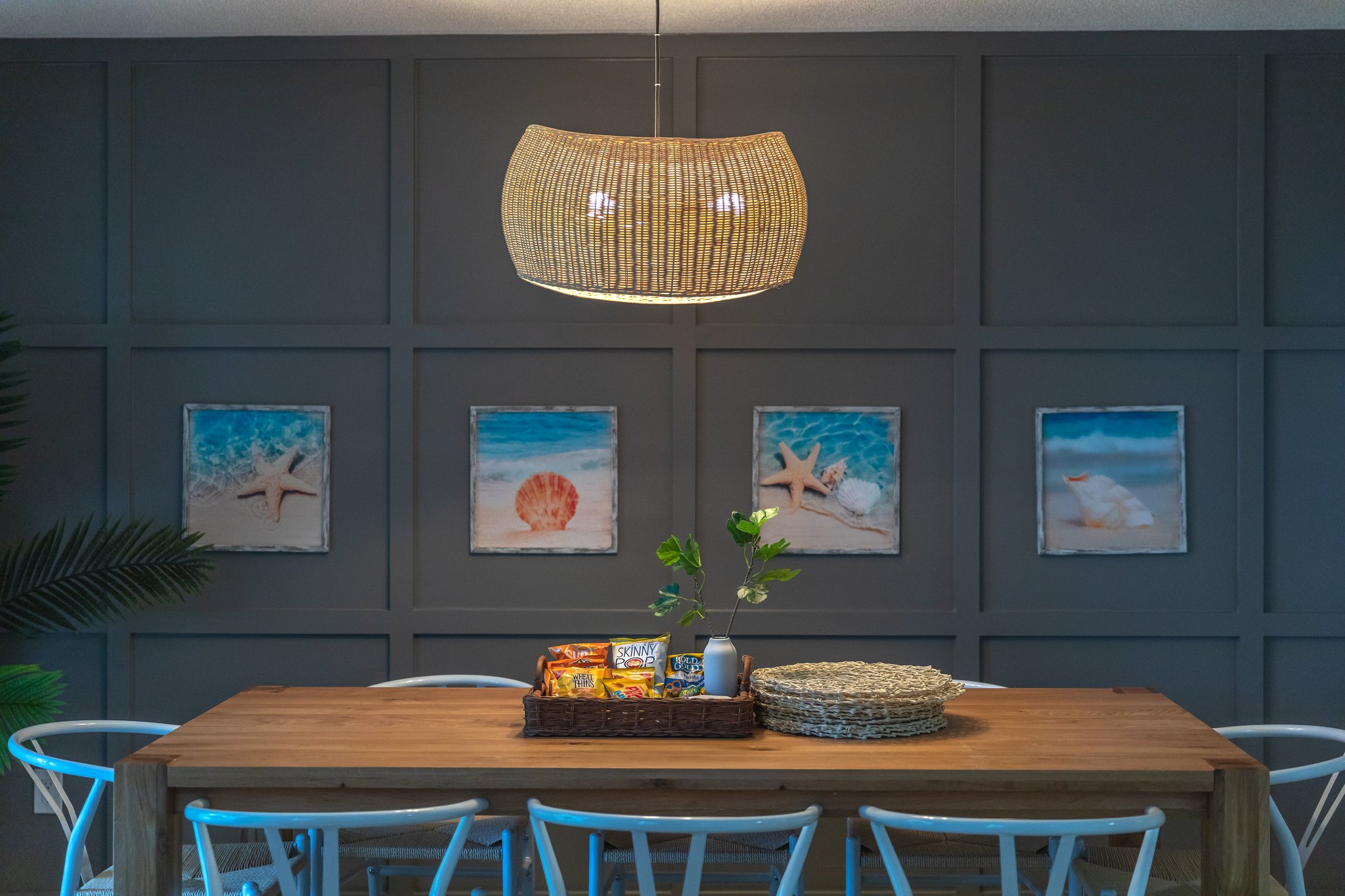 The third floor is a colorful sea themed kids bedroom with a bunk bed with two full-sized mattresses. Along the wall there is a beautiful decorative sea mural that gives the room a splash of fun – perfect for the kiddos! The other side of the wall is full of lovely beach decor, providing an opportunity to capture some new family memories.