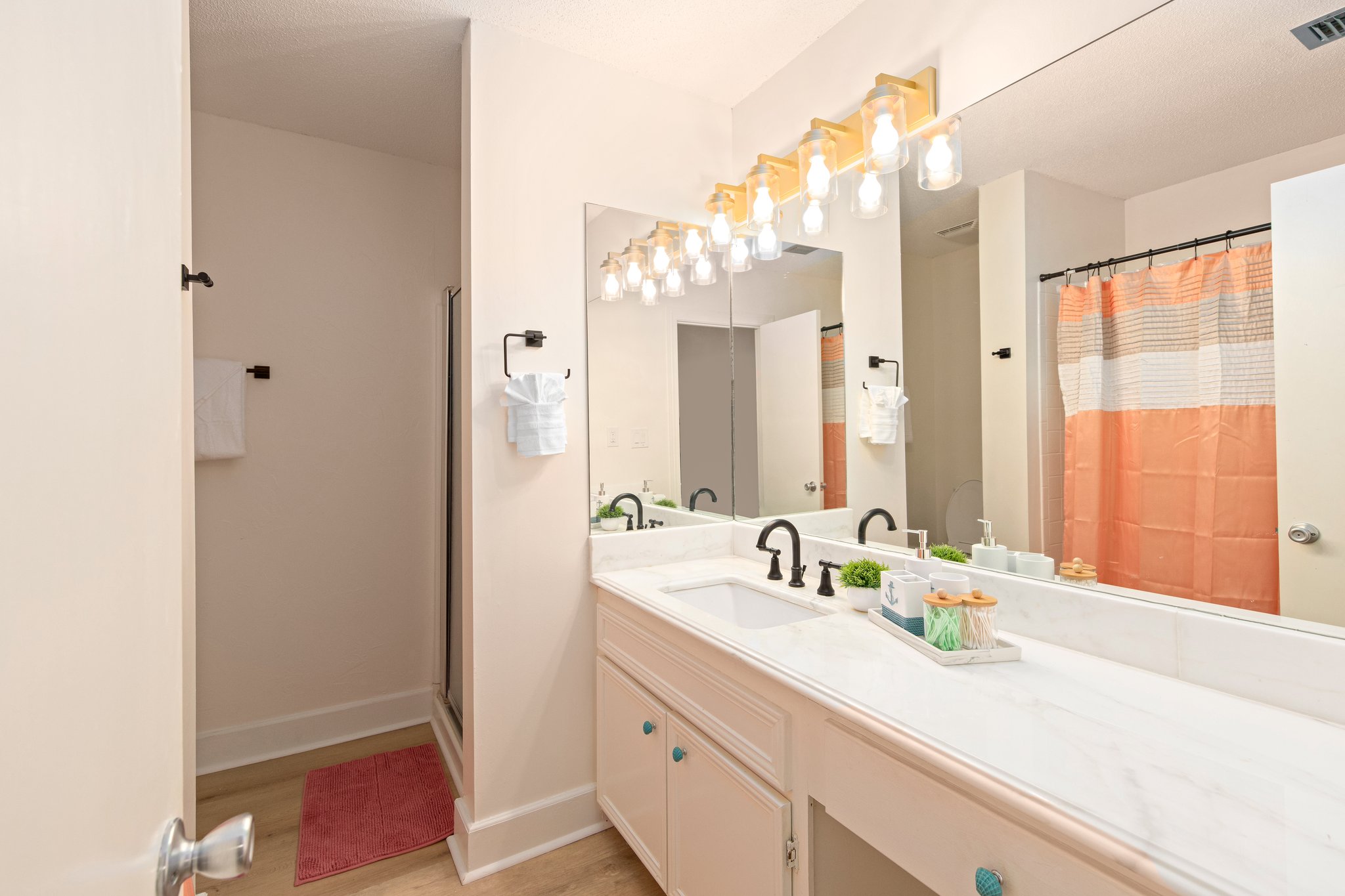 SUN + SWIM offers 3 levels of living, with 3 bedrooms and ensuite bathrooms. There are 2 king size beds, 1 bunk with two full size beds, and a sleeper sofa to accommodate up to 8 guests. This home is in the most desirable location, a 4 minute walk to the beach, while also allowing guests to enjoy the lake view from the spacious private patios. Take advantage of our amenities including complimentary beach setup (two chairs + umbrella), heated pool and tennis courts. Elderly guests in your group? NO PROBLEM! The living room, dining, kitchen, and one bedroom are all on the first floor - no stairs required!